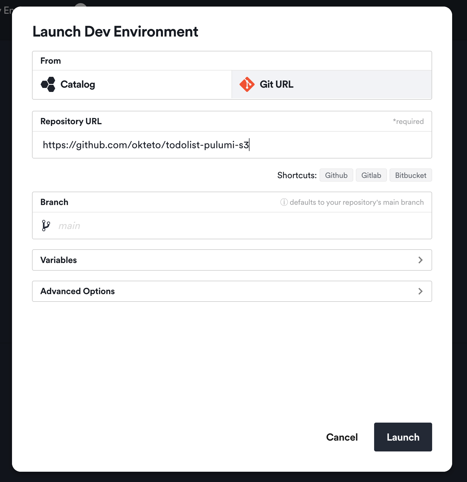 Once you have prepared your Okteto manifest and added the AWS credentials and Pulumi access token as Secrets in your Okteto dashboard, you are ready to deploy the application. It is worth noting that as Platform Engineers, Okteto also offers the option of setting these Secrets at a cluster level, eliminating the need for each developer to log into any cloud provider console. When it comes to deploying the application, you can make it available by preconfiguring it as part of the Catalog of applications. For the purpose of this tutorial, we can simply use the Git URL option: