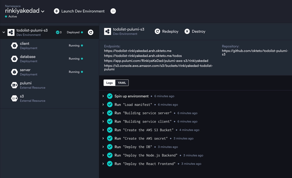 The script is pretty straightforward to understand. All we need to do is navigate to the folder containing our Pulumi configuration and execute the commands as usual to create the resources. One useful trick here is leveraging the ${OKTETO_NAMESPACE}