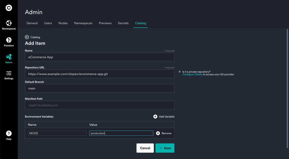 - The Catalog is integrated in the Okteto Experience user interface for “one click” launching of app environments.
