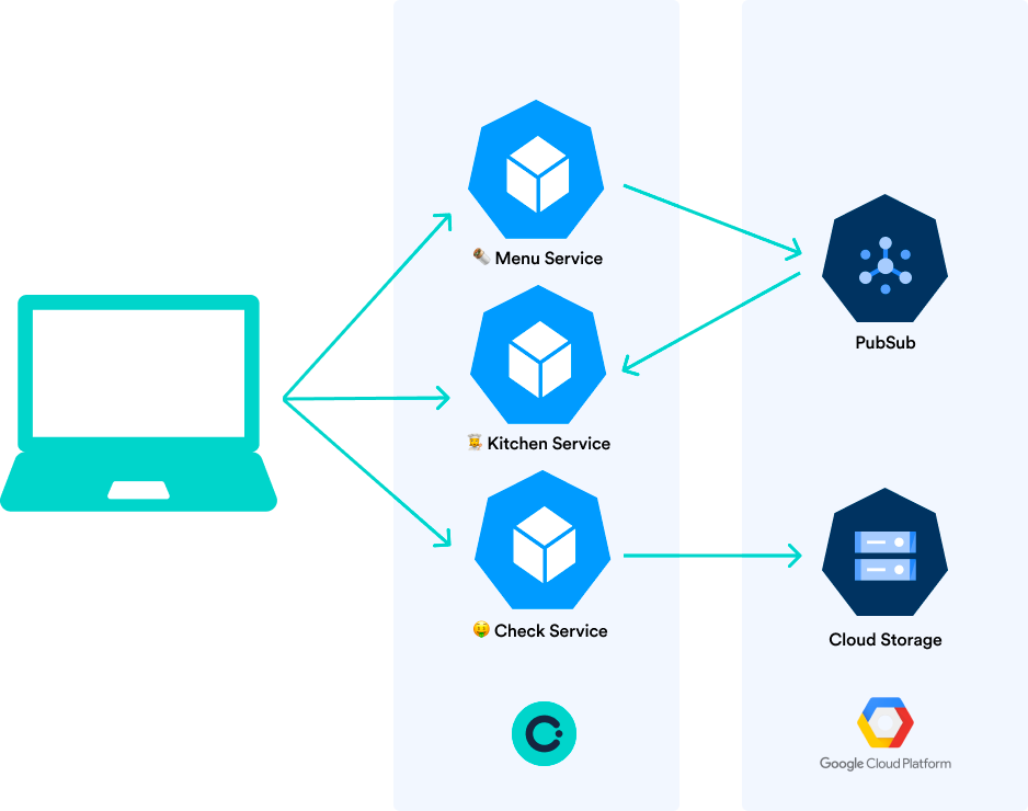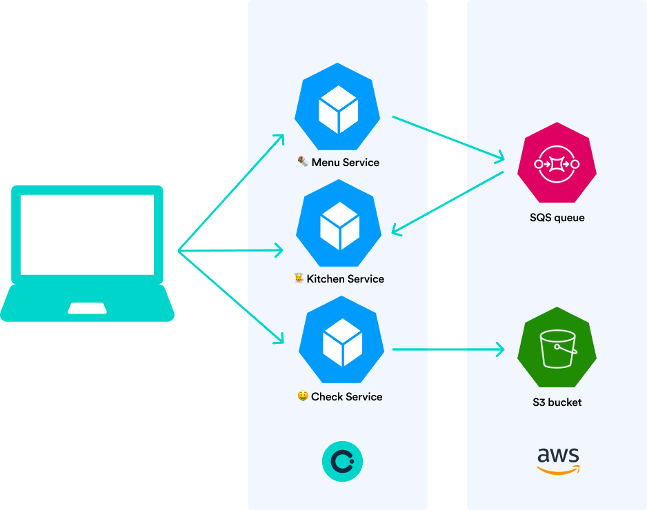 To demonstrate how you can use cloud resources as external resources, we have prepared a sample application running on Kubernetes development cluster for you. This app mimics modern applications and highlights the power of External Resources. The application is a restaurant portal consisting of three microservices: