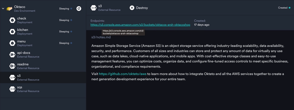 The power of this feature is that developers can work in a running Kubernetes development environment that already has all the cloud resources that the application uses, without needing to set anything up. They don't have to create the message queue or object storage every time. Another benefit of External Resources is that they're ephemeral, just like your Okteto development environments. This means that when you destroy your dev environment, the cloud resources created will also be destroyed with it. This makes it easier for platform engineers and team leads to manage resources without having to worry about chasing people around.