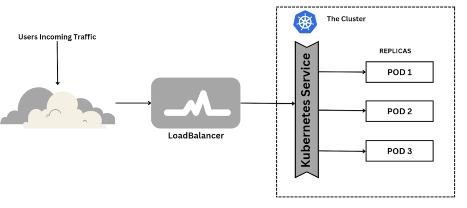 . The Load Balancer is then provisioned within the cluster to load balance incoming traffic across multiple pods.