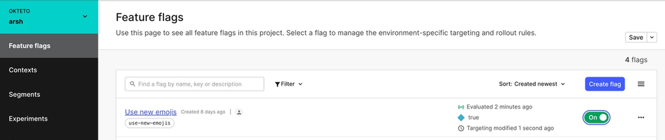 The application displays some text with an emoji. If you look at the code, you’ll see we use LaunchDarkly’s SDK to change the text and emoji when the feature flag is enabled. When you deploy the application using Okteto, Okteto not only deploys the app itself but also provisions a feature flag dashboard for you in LaunchDarkly. You can view this right from your Okteto dashboard.